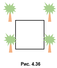 На рисунке 4.36 изображен план квадратного участка, по углам которого растут четыре больших дерева. Владельцы участка хотят увеличить его площадь вдвое так, чтобы деревья остались вне участка и участок остался квадратным. Возможно ли это сделать?