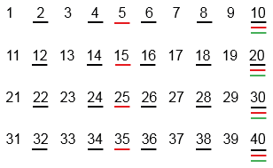 Выпишите сорок первых натуральных чисел в порядке возрастания и черным карандашом подчеркните каждое второе число, красным - каждое пятое, зеленым - каждое десятое.