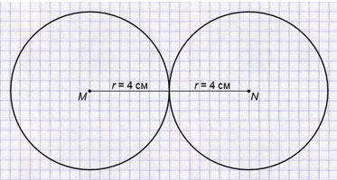 а) Чтобы окружности одинакового радиуса r с центрами в точках М и N имели одну общую точку, их радиус r должен быть равен половине расстояния между их центами М и N, то есть r = 4 см, так как 8 см : 2 = 4 см.
