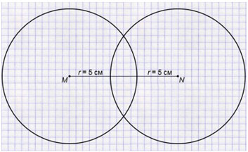 Отметьте точки М и N на расстоянии 8 см друг от друга. Проведите окружности одинакового радиуса с центрами М и N так, чтобы они: