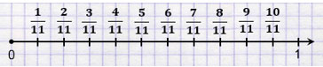 Знаменатель дроби (нижнее число) показывает, на сколько равных частей разделили целое (всего частей), а числитель дроби (верхнее число) - сколько таких частей взяли. У всех дробей, которые нам нужно отметить на координатном луче, в знаменателе стоит число 11, поэтому делим единичный отрезок на 11 равных частей, тогда одна часть будет составлять две клетки, т.к. единичный отрезок равен длине 22 клеток, а