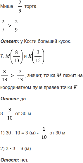 При сравнении дробей опираемся на правило, согласно которому из двух дробей с одинаковыми знаменателями больше та, у которой числитель больше, и меньше та, у которой числитель меньше. Точка на координатном луче, имеющая большую координату, лежит справа от точки, имеющей меньшую координату.