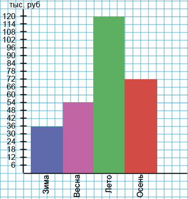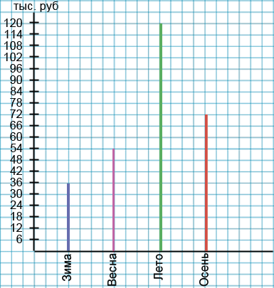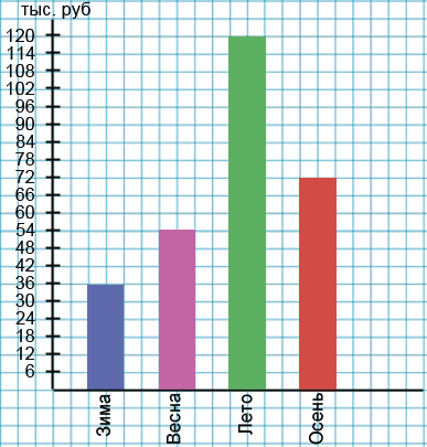 Тракторист работал весь год на фермера. За зиму он получил 36 тыс. рублей, за весну - 54 тыс. рублей, за лето - 120 тыс. рублей, за осень - 72 тыс. рублей. Изобразите данные с помощью столбчатой и круговой диаграмм.