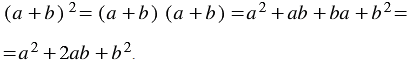 | Квадрат суммы двух выражений равен квадрату первого выражения плюс удвоенное произведение первого и второго выражений плюс квадрат второго выражения. |