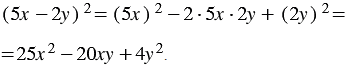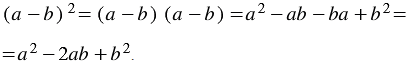 | Квадрат разности двух выражений равен квадрату первого выражения минус удвоенное произведение первого и второго выражений плюс квадрат второго выражения. |